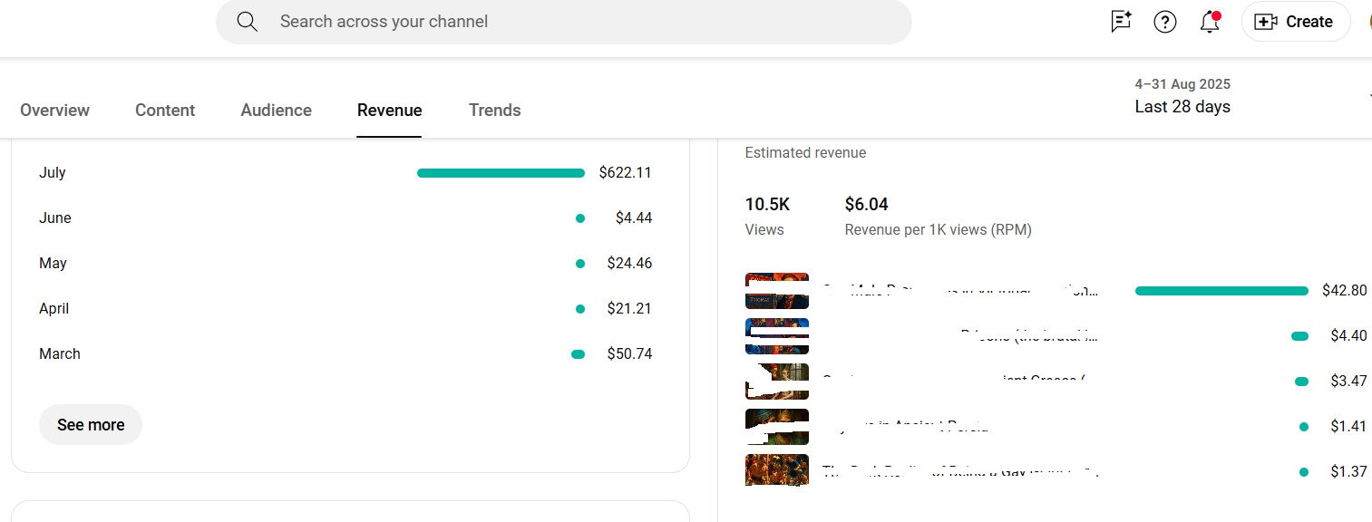 I started my 4th faceless YouTube channel in January 2025. By March, just two months later, it earned $50.74 (about ₱2,500) per month. By July, it grew to $622.11 (about ₱31,000) per month.